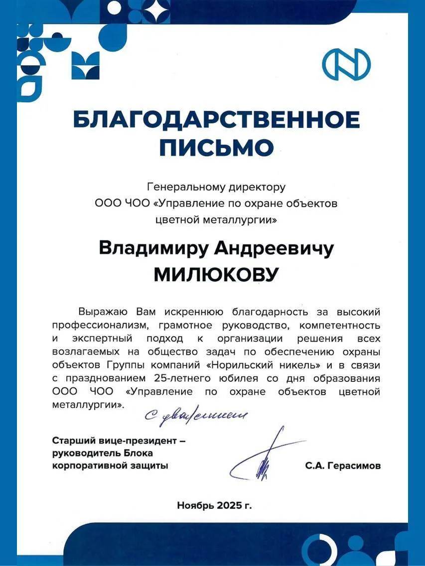 Сегодня компания ООО ЧОО «Управление по охране объектов цветной металлургии» празднует свое 24-летие!