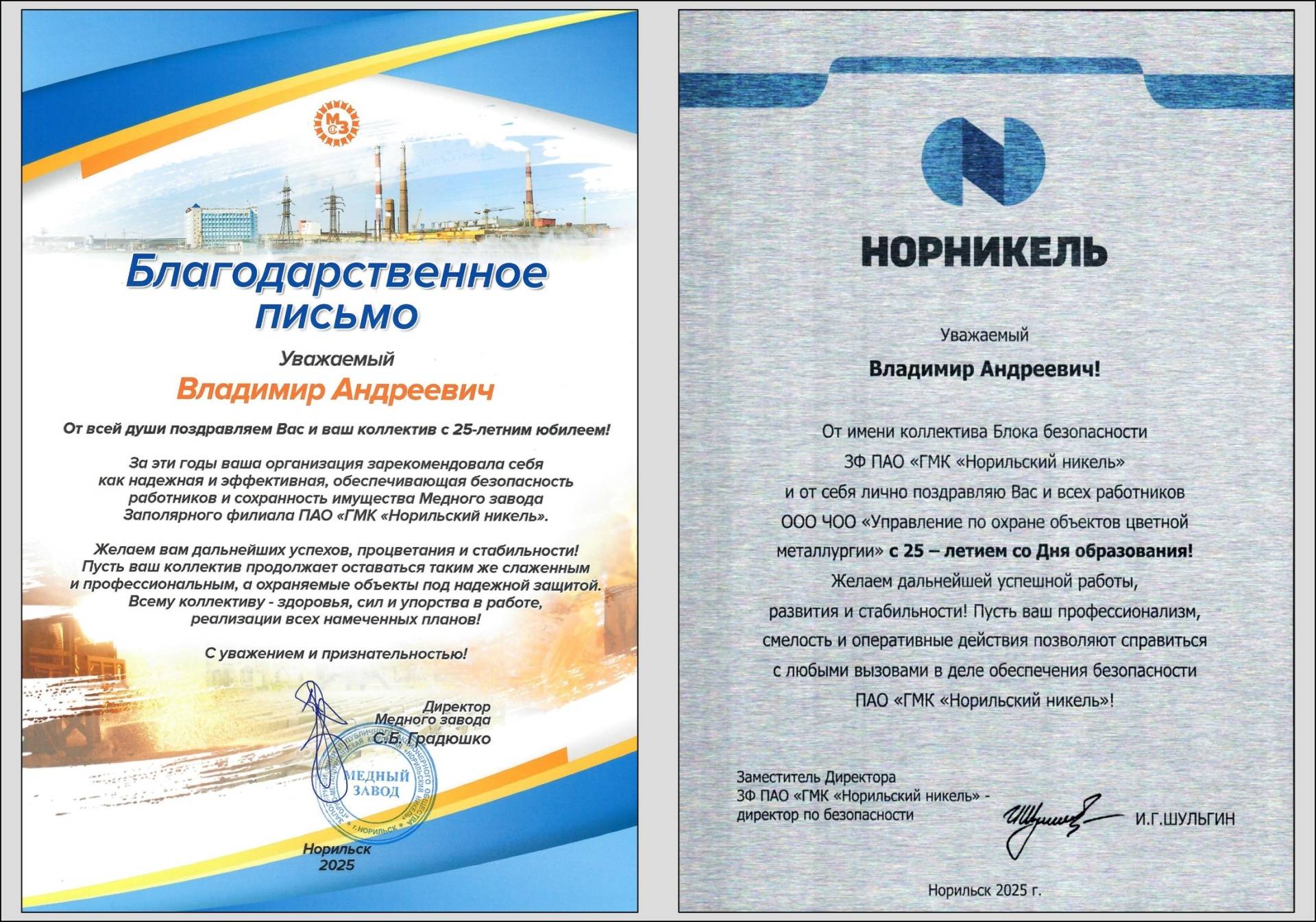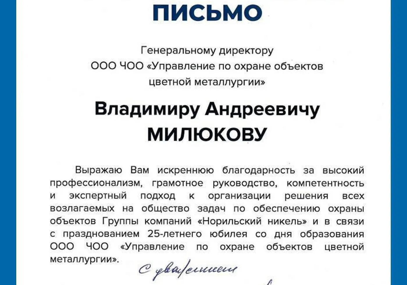 Благодарственные письма и поздравления в адрес Организации