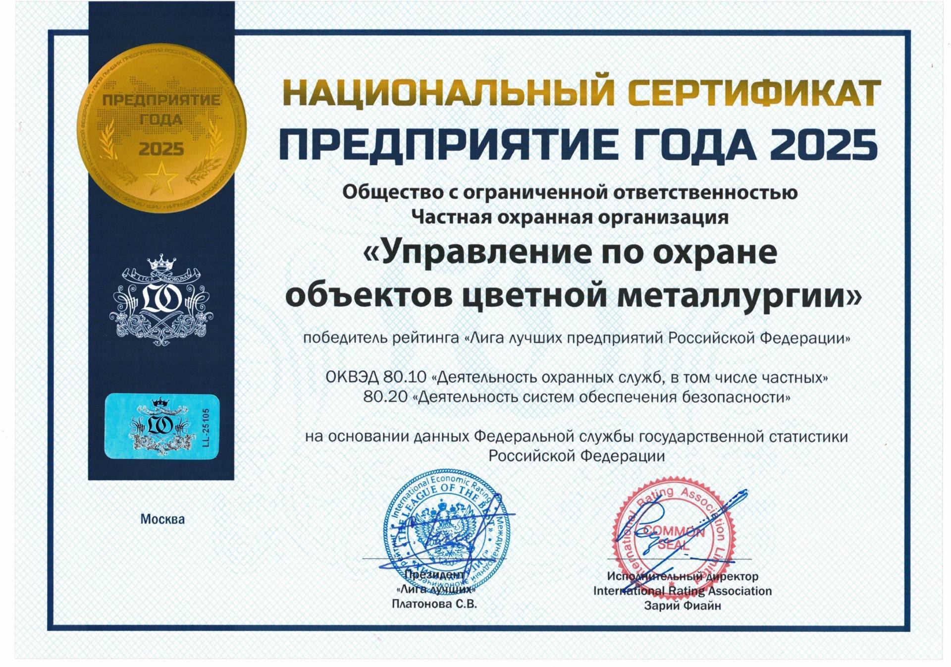 На основании данных Федеральной службы государственной статистики РФ ООО ЧОО «Управление по охране объектов цветной металлургии» определено победителем рейтинга «Лига лучших предприятий Российской Федерации» и награждено национальным сертификатом «Предприятие года 2025».