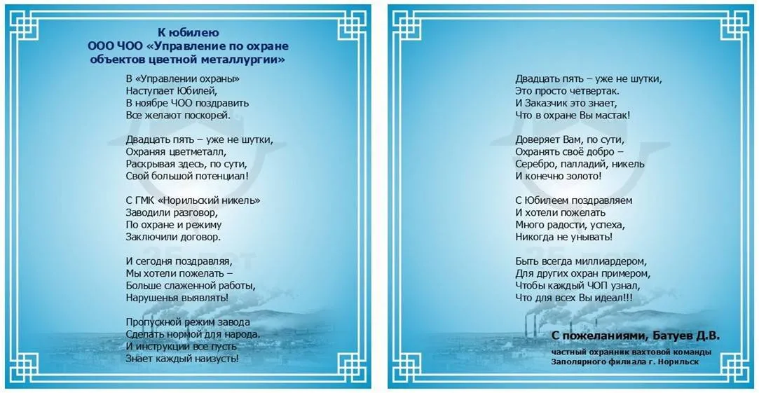 К юбилею Организации от частного охранника вахтовой команды Заполярного филиала